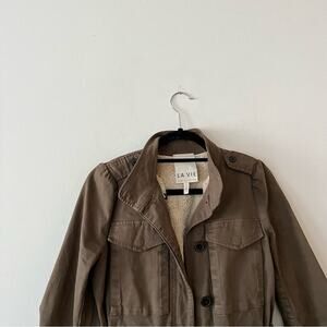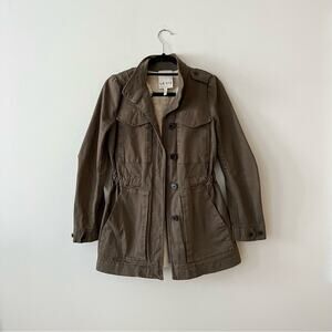 In good condition. Has a removable faux-fur lining. Army green, utility-style jacket.