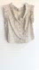 Elegant 100% cotton sleeveless button front blouse with pearl white background and black dots. Ruffled trim. Hits at the hips for versatile wear. Can be worn tucked inside pants, jeans or shorts.