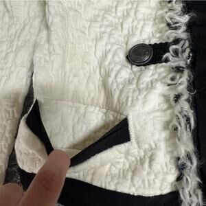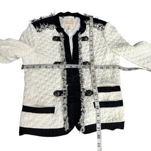 Black and white tweed blazer with fringe detail Front hook hidden closure with decorative front buttons See photos- some discoloration in the inner lining, not visible when worn See photos for approximate measurements All items come from a pet friendly and smoke free home.