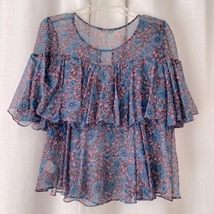 Lindsay floral print livens up a sheer backdrop, while an oversized, floaty ruffle lends to a fabulous spin. Billowy fit, keyhole at center front.
