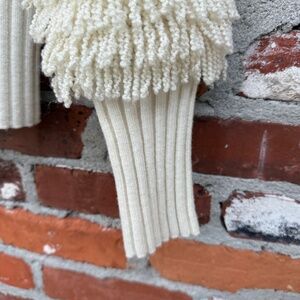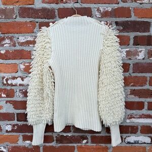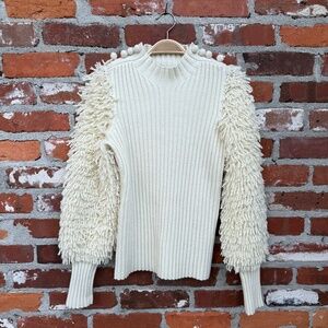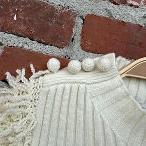 Chunky ribbed knit sweater with standing turtleneck collar and long sleeves with looped fringe accent. Crochet-covered pom pom bauble buttons at either shoulder. Stretch wool.