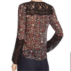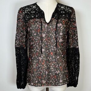 Rebecca Taylor ‘Lyra’ Red floral black lace silk blouse women’s size 00. Long sleeve, button cuff, sheer fabric with pintuck detail, v-neck front with tie, gorgeous black lace. Very good preowned condition. Approximate measurements 23” top of shoulder to hemline, 17.5” across chest, 23” sleeves.
