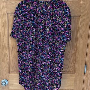Chic blouse with a colorful floral design. Features short sleeves and a loose fit.