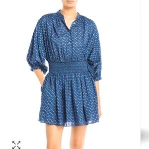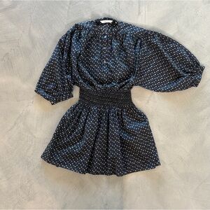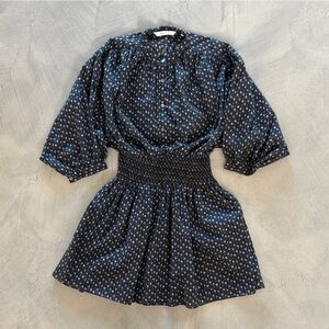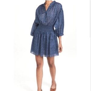 Rebecca Taylor Navy Blue Floral Long Sleeve x Material Smocked Waist Mini Dress