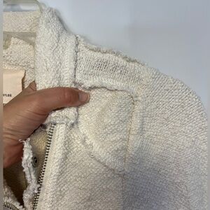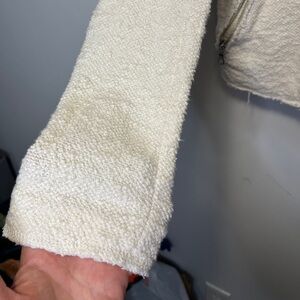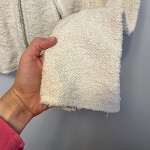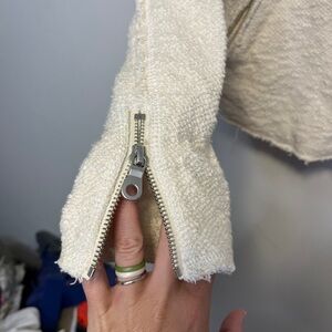 Soft textured nuby knit fitted jacket with reversed seams and silver statement hardware. Semi sheer panels at shoulders. No noted flaws