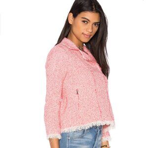 This Rebecca Taylor blazer features a soft pink color and a textured fabric that exudes elegance and modernity. The open-front design and frayed edges add a contemporary touch to its classic structure, making it a versatile piece for any wardrobe.