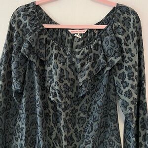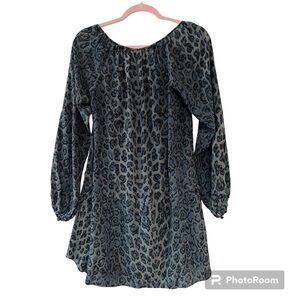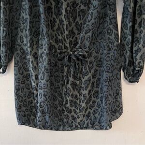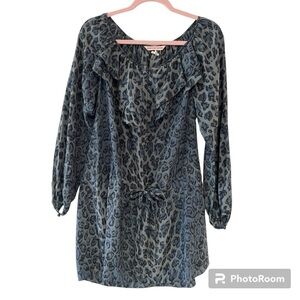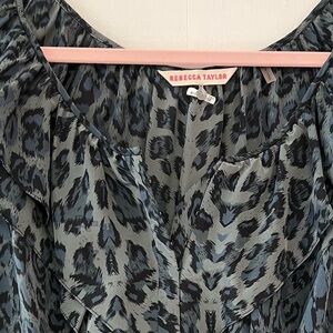 Rebecca Taylor Animal Print Silk Tunic Dress In Storm Cat. Double ruffle neckline. Lo g sleeve with covered button at cuff. Drawstring at waist. Hook & eye front closure.