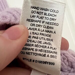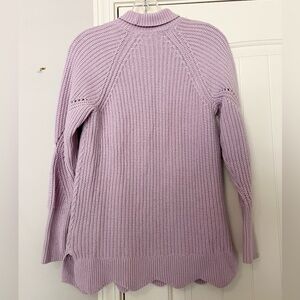 Purple wool knit (55% Merino Wool, 20% Cotton, 25% Nylon). Sweater. Long sleeves. High neckline. 27.5" from shoulder to hemline.