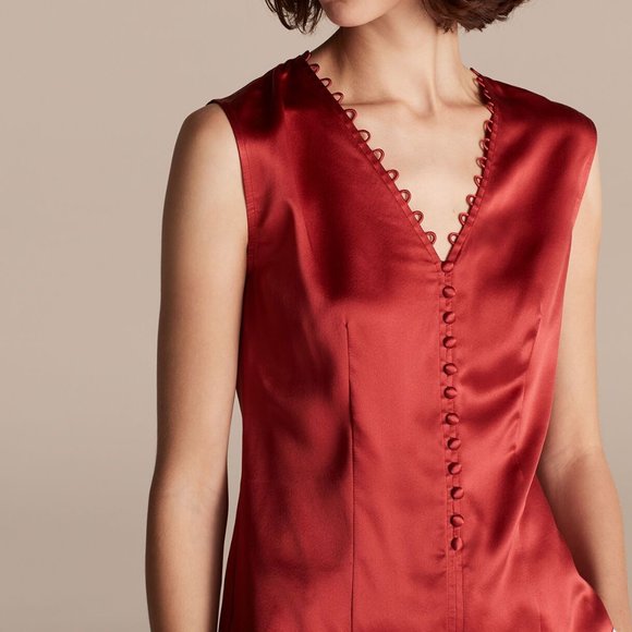 Elegant garnet-colored silk blouse with a button-front closure and tailored fit—perfect for the holidays! This luxurious piece has been worn once, hand-washed, and is in like-new condition with no defects. Approximate measurements: 23” length, 35” chest. True to size, size 0. A stunning addition to your festive wardrobe!