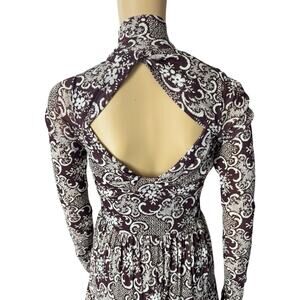 Rebecca Taylor Rochelle Fleur Pleated Maxi Dress. Pullover style with a mock neckline and open cutout back. This classy style dress also has sheer long sleeves and a flowy pleated skirt. Waistline is stretchy. The color leans brown with burgundy undertones.
