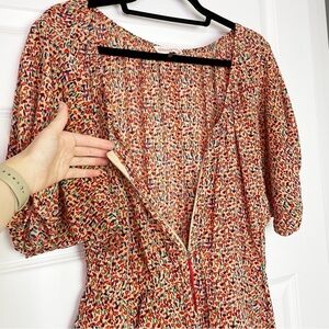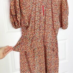 Excellent condition. Lightweight, 100% silk with gorgeous all over abstract brightly colored spring floral print. Feminine ruffle detail with cinching at waist gives a flattering sheath silhouette. Quarter zip detail in front adds a fun detail and makes the dress nursing friendly as well.