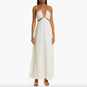 Rebecca Taylor rumpled‑stripe halter maxi dress in crisp white combo, features a plunging halter neckline with self‑ties, sleek side cutouts, and a relaxed column silhouette—perfect for resort-ready daytime events or beachside evenings.