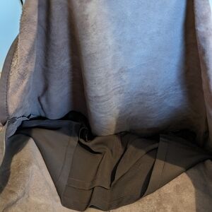 Leather dress with front pockets. The color is eggplant/purple with brownish undertones. A few small white spots in the back as shown in the last photo. Lined. Pre-loved. GUC.
