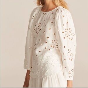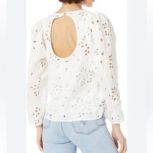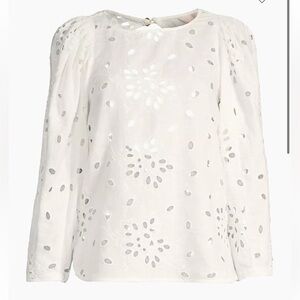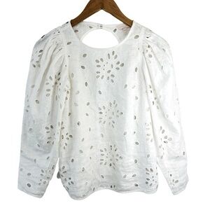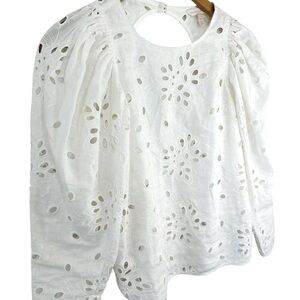 Like New! Rebecca Taylor Sarah Linen Eyelet Embroidered Puff Sleeve Open Back Blouse in White
