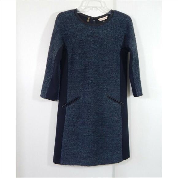 Rebecca Taylor Shift / Sheath Tweed Dress , leather trim pockets, navy blue