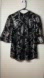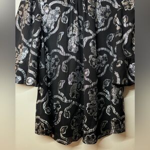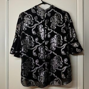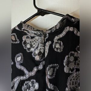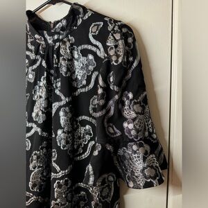 Black silk blend with oversized silver metallic floral print, mock neck, lined, short bell sleeves, boxy fit, zippered back. Evening wear, formal, professional, business wear, academia, office, etc.