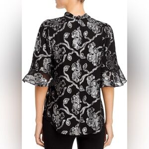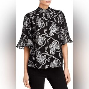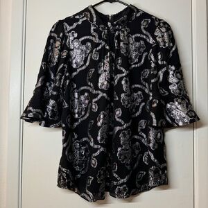 Rebecca Taylor Silk Blend Black Silver Lurex Metallic Bell Sleeve Blouse