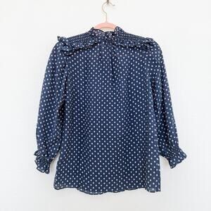 Rebecca Taylor Silk Blend Peasant Ruffle Polka Dot Blouse Navy