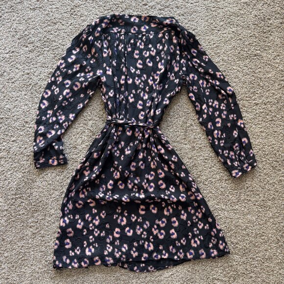 Rebecca Taylor Silk Cheetah Jacquard Print Wrap Long Sleeve Dress Size 10 Black