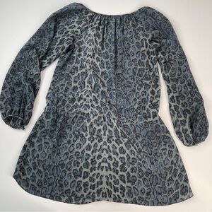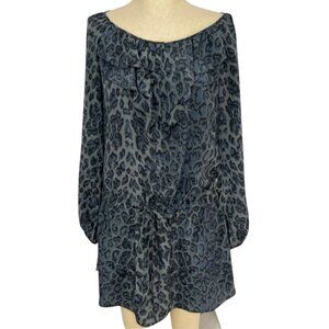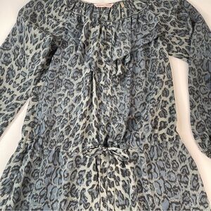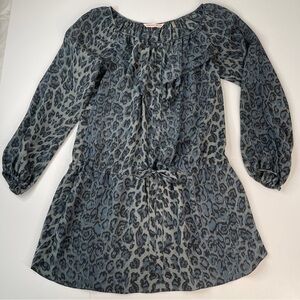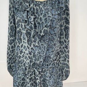 Rebecca Taylor silk leopard print mini dress in blue, gray, and black. Features a ruffle front and a tie at the waist.