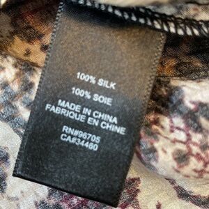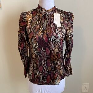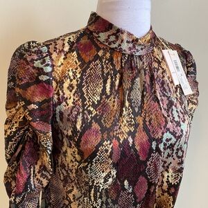 100% silk , multicolored snakeprint blouse. Mock neck with button keyhole at back. Ruched long sleeves. NWT