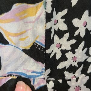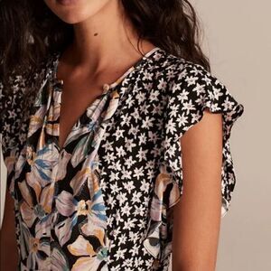 Rebecca Taylor Sleeveless Fleur Mix Dress, Boho Cottagecore Silk Blend | 12 | Previously Loved Condition | MSRP $395 | Design Print is called Black Combo | Lined | Hidden Zipper Closure in Back | Front Keyhole with button in front | Flutter sleeves | Measurements Laying Flat and Unstretched: Pit to pit 19" | Waist 17" | Length 37" | Flutter Sleeve Length 3.5" | A combination of a abstract bloom print patched together with a star floral.