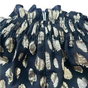 Shimmering metallic leopard-like spots add a layer of glamour to a light and airy top featuring a smocked high neck and pretty flutter sleeves