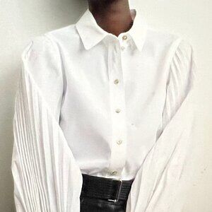Inspired by a classic men’s shirt, this essential blouse is transformed with a soft blend of washed cotton and eco-friendly Tencel™, a voluminous, pleated sleeve, and trapunto finishing.