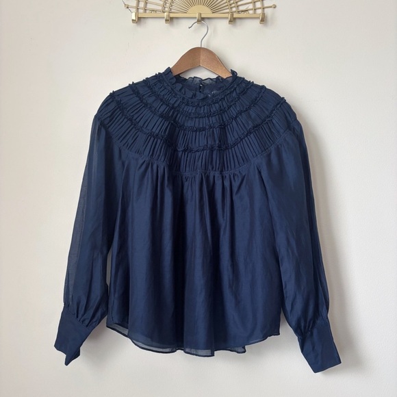 Rebecca Taylor Smocked Silk Top 4 Mock Neck Navy Blue