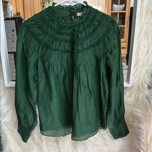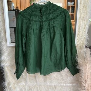 About the brand: Romantic. Sophisticated. Nostalgic. Smocked Silk-Blend Blouse in emerald with mock neck and button cuffs Approximately 24in from shoulder to hem Model is 5'9.5 and is wearing a size small. Measurements may vary slightly by size. Triple button-and-loop closure Shell: 70% cotton, 30% silk Lining: 100% cotton Hand wash Imported