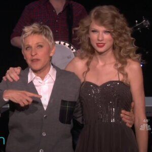 Rebecca Taylor Strapless Chiffon Sequin Dress as seen on Taylor Swift on the Ellen Degeneres show in 2010. Same style, brand and color. It's a charcoal grey shade.