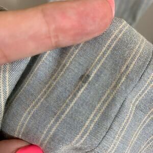 Size 8. 53% Viscose 45% Wool 2% Spandex. Inseam 30 inches. Waist 32 inches. Rise 9 inches. Leg opening 12 1/2 inches. The trim is silk. Jewel flower waist button. Small stain on the back lower inner seam of the pants shown on the last picture. Not seen when worn. Flowy. Beautiful pants. Other the small stain they are in great condition.