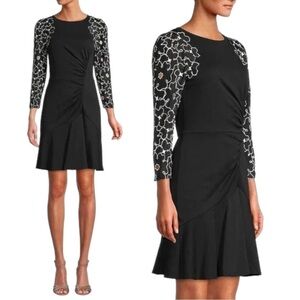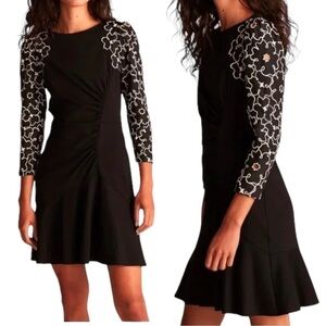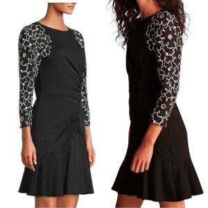 Rebecca Taylor "Tai Floral Embroidered Dress" is a classy, ruched long sleeve dress in black. Romantic floral embroidery at the sleeves define this elegant LBD. This smooth jersey dress is shaped with an off-center gathered seam that creates a subtle drape, and is accented with whimsical embroidered floral sleeves crafted from silk-cotton habotai. An elastic waist and flounced hem add to the feminine shape.