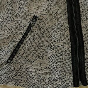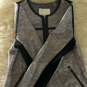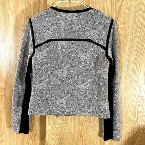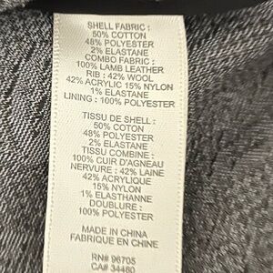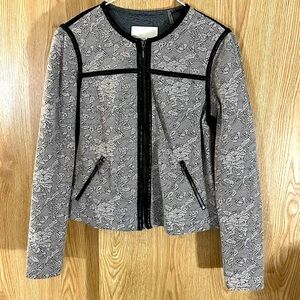 This blazer is really beautiful with a floral herringbone pattern, soft and warm wool blend and soft leather trim, cropped style, full front zip and front pockets.