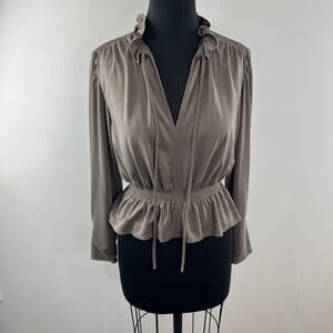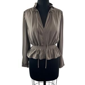 Rebecca Taylor Taupe Blouse Slit Neck Smocked Waist Balloon Sleeve Size X-Small