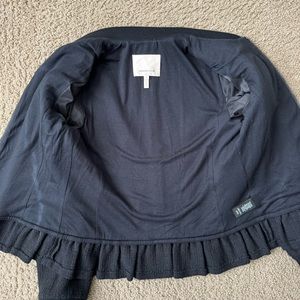 Pre-owned condition. Rebecca Taylor Textured Tweed Ruffle Jacket in a size 6. Color: Black. Femme meets sportif in this Rebecca Taylor textured tweed jacket. Ribbing at the neck and cuffs and a delightful ruffled hem. It has a casual fit with a zip front closure. Dress it up or down. 48% cotton, 40% acrylic, 10% polyester, 2% viscose. Body lining: 100% lyocell. Sleeve lining: 100% polyester. Dry clean. Thanks for viewing!