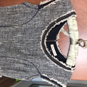 Tweed dress with metal detail around neck. Cap sleeves. Hits right above knee.