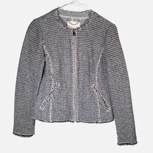 Style: Tweed/bouclé jacket — zip‑front, crew neckline, long sleeves, subtle peplum seaming, front welt pockets with fringe detail, fully lined