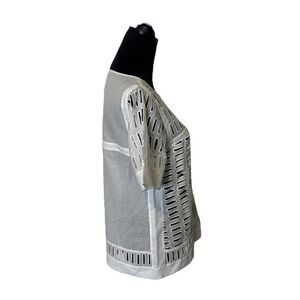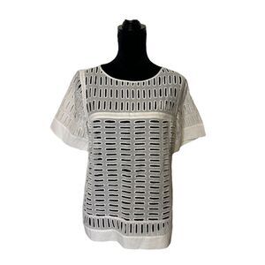 Rebecca Taylor Voile Eyelet Cotton Sheer White Top. A boxy top styled in lightweight cotton eyelet. Layered trim gives the piece easy structure, and a delicate voile back panel completes the silhouette. Short sleeves. Semi-sheer. Gently worn condition. Fabric: Cotton eyelet. Shell: 100% cotton. Measurements in pictures.