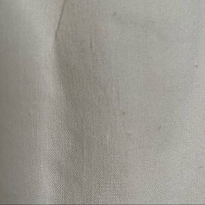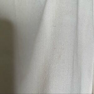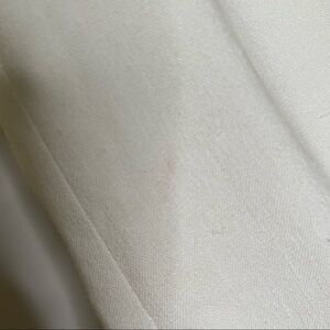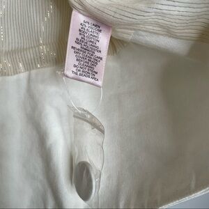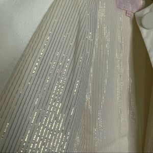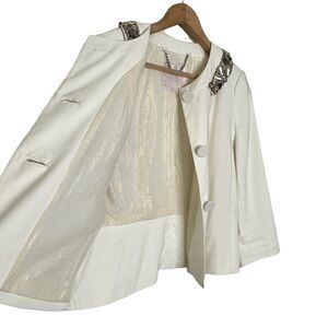 Off white tone. Embellished collar with beads, and sequins. Large fabric covered buttons. Waist length. 3/4 length sleeves. Shimmery metallic gold striped liner. Linen blend. Comes with attached extra button.
