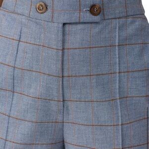 These trousers are a stylish pair of plaid pants in a light blue color with a subtle checkered pattern featuring thin brown lines. The pants are tailored with a slim, straight-leg cut, giving them a polished and sophisticated look, ideal for both professional and casual wear.