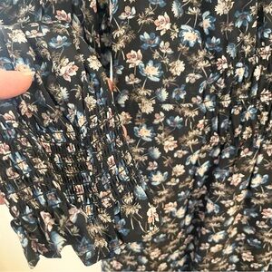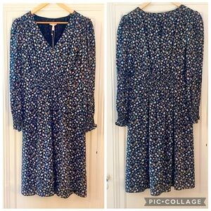 Rebecca Taylor Zelma silk midi dress, ditsy blue and cream floral print on black, size 8, new with tags. Long puff sleeves with elasticized cuffs and waist, v-neck pullover style with polyester lining. Shell is 100% silk, dry clean only. Measurements lying flat are about 19” chest, 14.5” waist unstretched, 17” hip, 41.5” long from top of shoulder to hem.