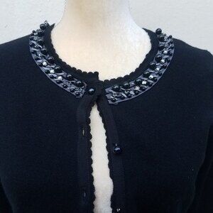 Rebecca Taylor black cardigan sweater size medium . Black button front silk /cashmere cardigan sweater , long sleeve, with button embellishments on the neck .