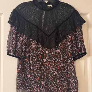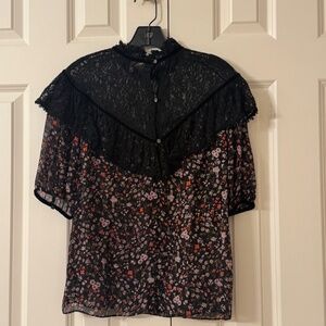 Rebecca Taylor floral blouse with black lace yoke, size 6, shell is 100% silk, lace is 100% cotton, combo fabric is 70% nylon and 30% cotton