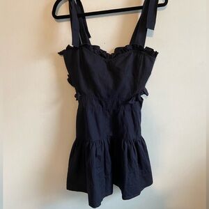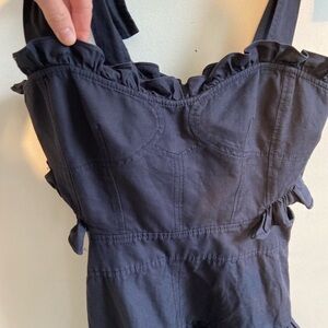 Rebecca Taylor Crisp Cotton Cut Out Navy Blue Dress. Size 4. Dress is in great pre-owned condition! This ruffle-trimmed mini dress has corset-inspired seaming, bow-tied straps and cutouts on the side for a sexy feel. Back zip closure.