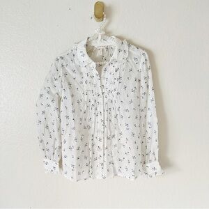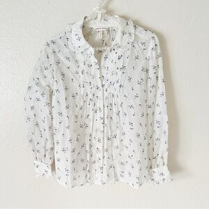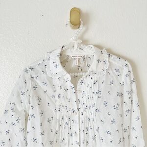 Rebecca Taylor spring floral voile top; button down; mini blossom print; pleated bib; classic collar and shirt cuffs; ruffles at sleeve and collar; hits low at hip; 25 inches from high point of shoulder; 70% cotton, 30% silk