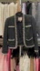 Gorgeous Chanelesque tweed jacket in black and white, with silver chain details. Length of jacket is approximately 20in, sleeve measured from top seam of jacket is 21.5in and from underarm seam is 16in.