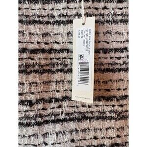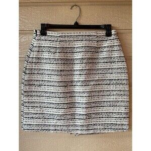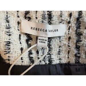 New with Tag $245, Rebecca Taylor women's White & Black Stripe with Shimmery Silver Metallic Threading Faux Wrap Above-the-Knee to Mini Skirt (depending on your height), size Medium, fully lined Tweed Boucle Knit fabric, hidden zipper with hook & eye closure on left side, front faux wrap flap accent.