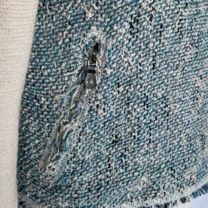 Step up your game with this Rebecca Taylor cropped cotton blend tweed boucle zip up. Beautiful versatile blend of soft blue, white and cream. Great over a dress for work or t-shirt and jeans, either way adds a polished touch. Side zip pockets. Looks great zipped up or unzipped. Size 4