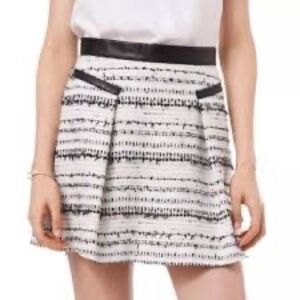 Raffia tweed gives an unfinished vibe to this black & white skirt. A metallic element & leather detail add polish. Pleat front & back. Pair with a tee for casual style, or try it with an embellished top for an elevated look.
